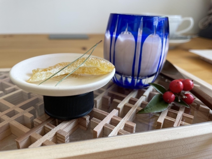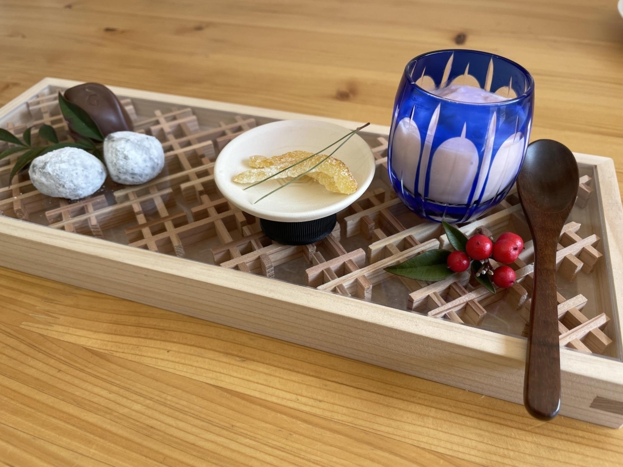 お話を伺いに行くと、組子トレーを使ったお茶セットをご用意してくださっていました。(ありがとうございます!)