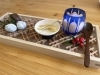 家族で制作体験をした組子のトレー(株式会社佐田建美の組子体験で制作)を中心に膳を構成し、家族の思い出の品である茶器などを配置し空間を演出。年越しそばを食べながら、新年に向かってゆく凛とした気持ちを表現しました。