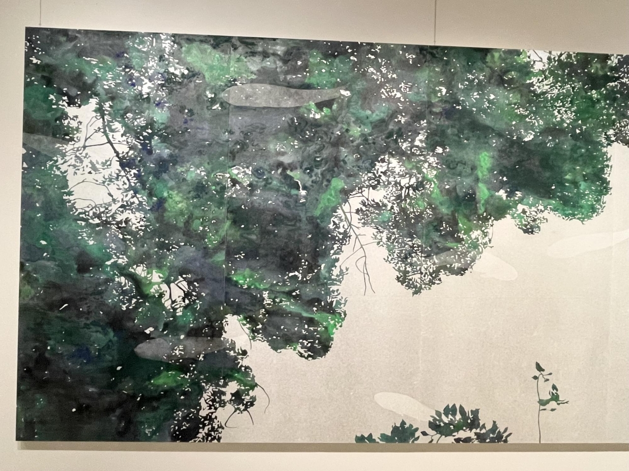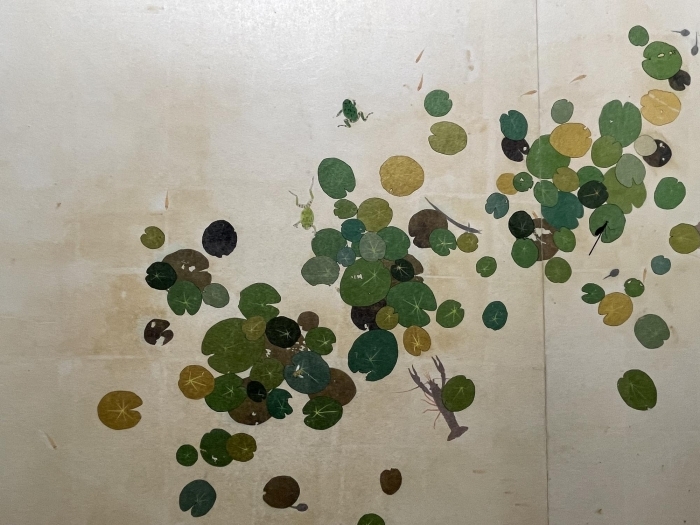 作品の前に立つと、まるで、水に潜って水の底から水面を見上げ、キラキラの木漏れ日と鯉が泳ぐ様子を見ているような気持ちになりました。ぜひ水の中から空を見上げる気持ち、味わってみてください♪
