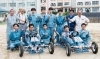 撮影に協力してくれたのは、技術室に集まってくれた製作班9名の生徒達と、活動支援や製作指導を行う皆さん。校舎をバックに、みんなで手がけた2台のゼロハンカーを囲んでガッツポーズ! 全国大会リベンジへの期待が高まります!写真撮影:高瀬智司(フォトルプ)