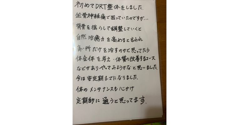 腰椎すべり症を発症されていて、5回ぐらいの来院で、坐骨神経痛が楽になられました。良かったですね。