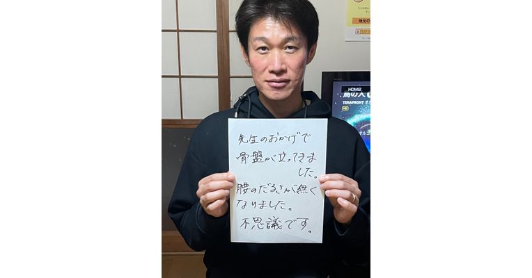 お忙しい中通って頂きありがとうございました。楽になられて良かったです。背中をゆらゆらするだけで改善するので皆さん不思議がられます。