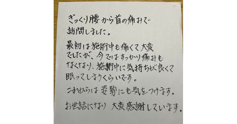 激しい痛みの中お仕事をしながら、セルフケアと通院を1ヶ月半頑張られました。すっかり良くなられて私もほっとしています。これからもメンテナンスで顔を見せて下さい^_^
