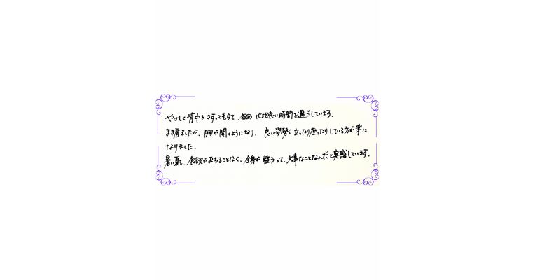 全身の整えに一月に一度、御来店頂いています。肩凝りも楽になられたとの事で、こちらもとても嬉しく感じております。